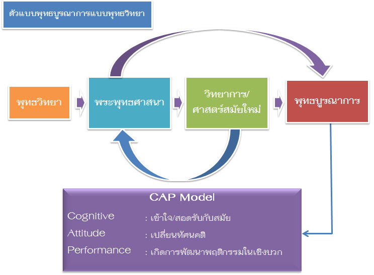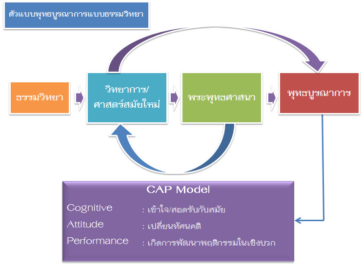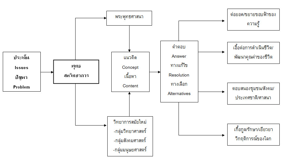 (๑) วิธีการบูรณาการแบบพุทธวิทยา (Buddhology) ซึ่งเริ่มต้นจากการกำหนดหรือแสวงหาประเด็น (Issues) และปัญหา (Problems) ทางวิชาการ หรืองานวิจัยที่มีการถกเถียง หรือแสวงหาทางออกที่ควรจะเป็นต่อประเด็นต่างๆ ที่มนุษย์ ชุมชน หรือสังคมสนใจ หลังจากนั้น จึงนำพระพุทธศาสนามาเป็นฐานในการอธิบาย ขั้นตอนต่อไปจึงเข้าสู่กระบวนการของการนำวิทยาการ หรือศาสตร์สมัยใหม่มาอธิบายเสริม โดยมีเจตนารมณ์เพื่ออธิบายสนับสนุนให้พระพุทธศาสนาทันสมัย มีเหตุผล และสอดรับกับวิถีความเป็นไปของชีวิตและสังคมมากยิ่งขึ้น ซึ่งวิธีการเช่นนี้ มิได้เจตนาที่จะก่อให้เกิดสัทธรรมปฏิบัติ หรือทำให้พระพุทธศาสนาสูญเสียจุดยืนของตัวเอง ดังจะเห็นได้จากแผนภูมิดังต่อไปนี้