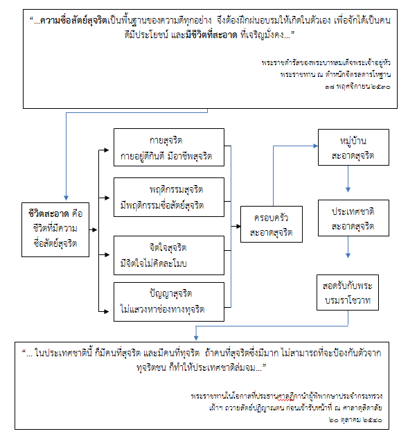 จากแผนภูมิข้างบนจะพบประเด็นของการพัฒนาหมู่บ้านช่อสะอาดดังที่ได้กล่าวแล้วในเบื้องต้นว่า มีจุดเริ่มต้นมาจากพระราชดำรัสของพระบาทสมเด็จพระเจ้าอยู่หัวที่มีจะเห็น “ชีวิตสะอาดคือชีวิตที่มีความซื่อสัตย์สุจริต” และหากขยายความของความว่า “ซื่อสัตย์สุจริต” นั้น หมายถึง ความสุจริตทั้งกาย พฤติกรรม จิตใจ และปัญญา เพราะเมื่อกายมีอาชีพที่สุจริต พฤติกรรมไม่มุ่งแย่งชิง หรือทุจริตคดโกง จิตใจไม่ละโมบโลภมาก และปัญญาที่ไม่แสวงหาช่องทางทุจริต ย่อมส่งผล ความสุจริตของครอบครัว ทั้งพ่อ แม่ และลูกด้วย ความสะอาดของแต่ละครอบครัวจึงส่งผลต่อความสะอาดของหมู่ในภาพรวมอันเป็นหน่วยนับรวมของครอบครัว และจะส่งผลต่อสังคม ประเทศชาติให้มีความสะอาดต่อไป ดังนั้น หากหมู่บ้านสะสมความสะอาด ซื่อสัตย์สุจริตได้มากขึ้น ย่อมส่งผลต่อต่อประเทศชาติในฐานะที่จะมีภูมิคุ้มกันการทุจริตคดโกงต่อไป