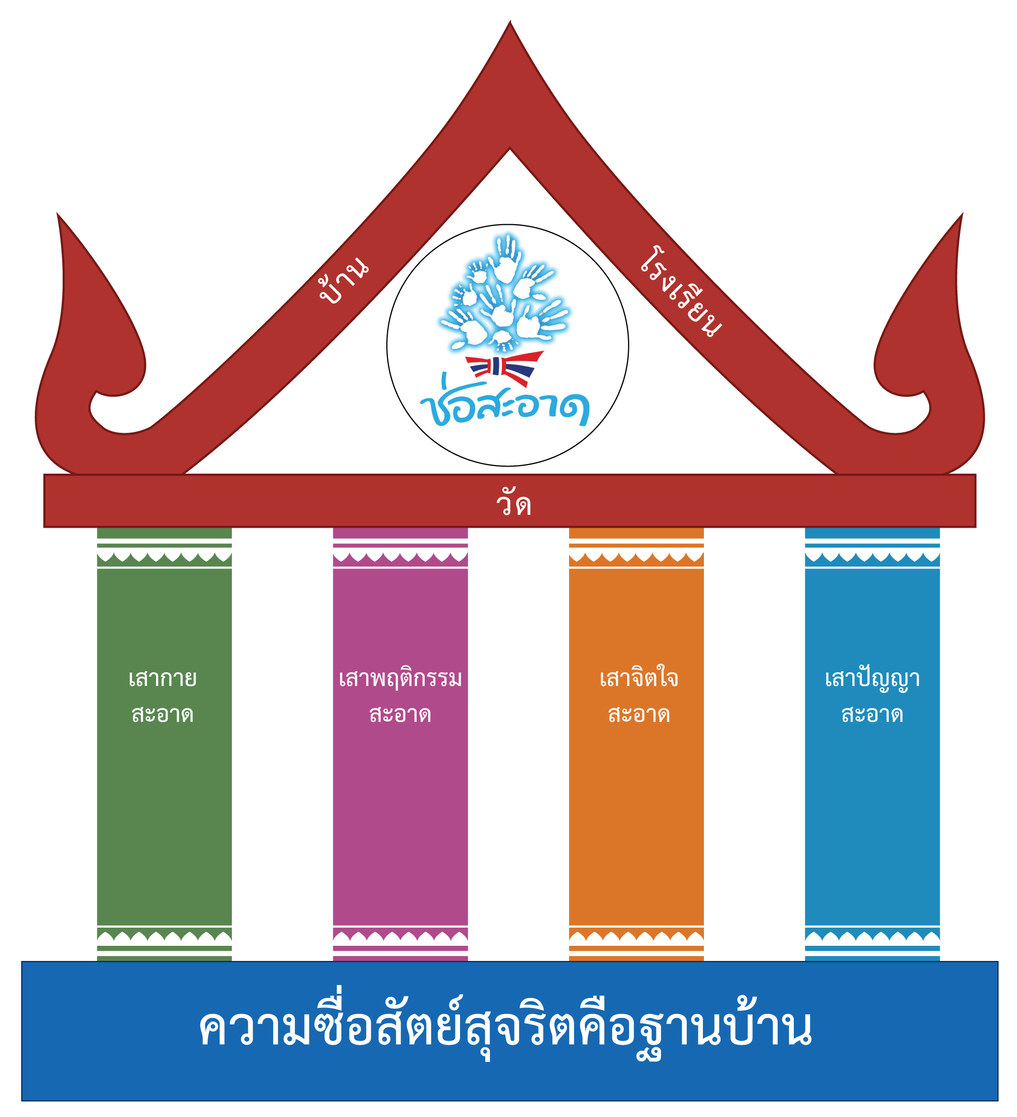 (๒) เสา ๔ ต้น คือ เสากายสะอาด เสาพฤติกรรมสะอาด เสาจิตใจสะอาด และเสาปัญญาสะอาด ที่ผุดขึ้นบนเสาเข็มคือความซื่อสัตย์สุจริต ความเจริญงอกงาม และแข็งแกร่งของเสาเข็มย่อมส่งผลต่อเข้มแข็งของเสาแต่ละต้นด้วยเช่นกัน ฉะนั้น ความสะอาดของเสาจะเกิดขึ้นไม่ได้หากรากฐานแห่งความซื่อสัตย์สุจริตไม่เข้มแข็งเพียงพอ
